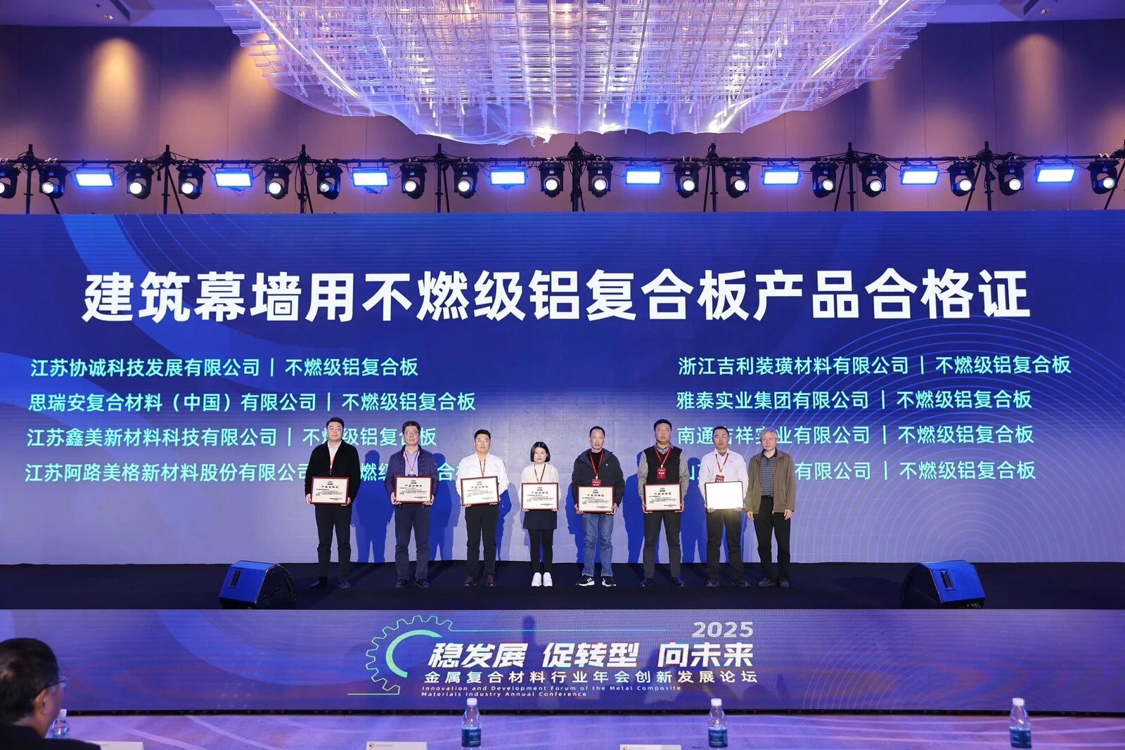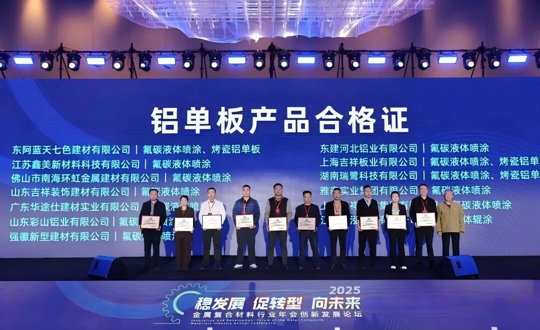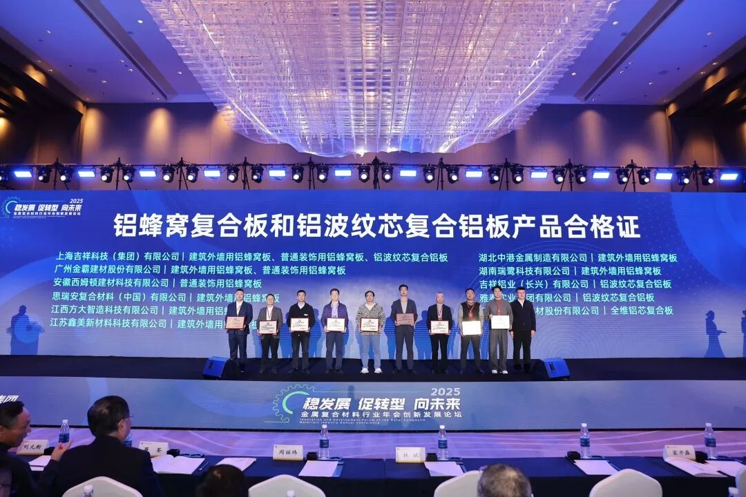 雅泰實業(yè)集團參加本次年會,會上,集團的氟碳液體噴涂鋁單板、不燃級鋁復合板、鋁波紋芯復合鋁板等產品分別榮獲“新國標,高質量”產品合格證。