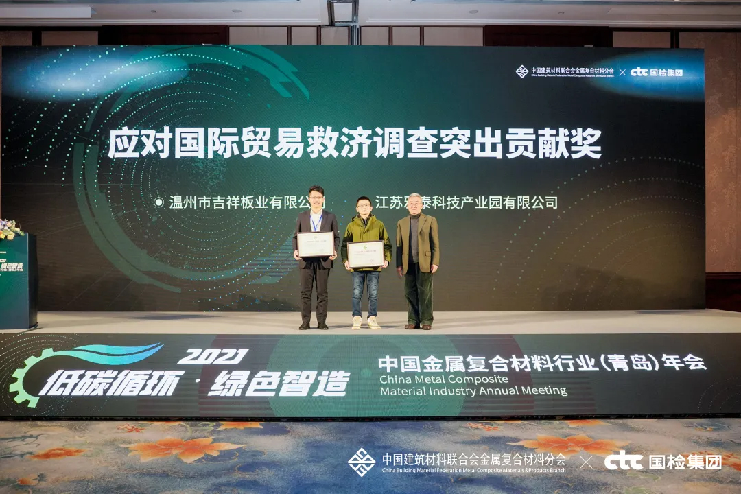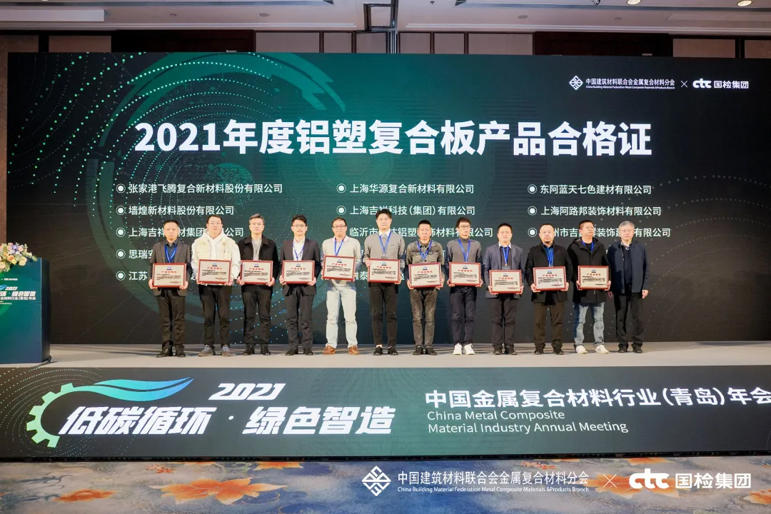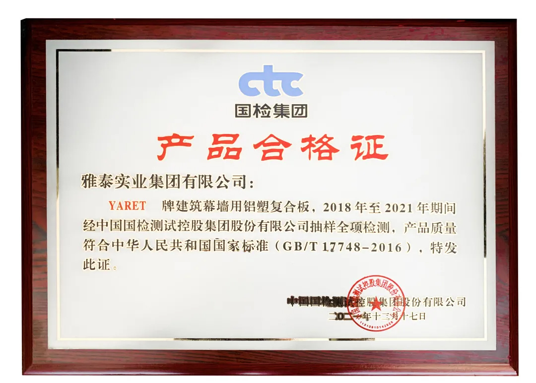 會上,對2021年度行業(yè)優(yōu)秀的產(chǎn)品與企業(yè)進行了表彰頒獎——雅泰 YARET 牌鋁塑復(fù)合板,于2018年至2021年期間經(jīng)中國建材檢驗認(rèn)證集團股份有限公司抽樣全項檢測,產(chǎn)品質(zhì)量符合中華人民共和國國家標(biāo)準(zhǔn)(GB/T 17748-2016),榮獲2021年度CTC認(rèn)證產(chǎn)品合格證。